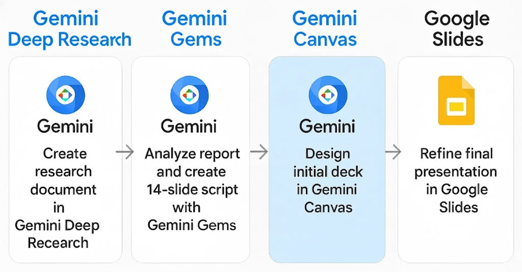 This workflow connects Gemini and Google Workspace applications into a complete research-to-presentation process: