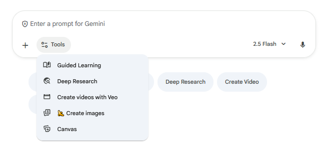In Gemini, go to the Tools section and make sure Deep Research is selected. This ensures Gemini runs a full research process rather than a quick answer mode.